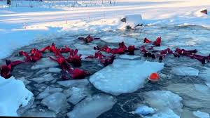 சிவப்பு நிறத்தில் விண்வெளி உடை போல் தோற்றமளிக்கும் வெப்பத்தை தக்கவைக்கும் சிறப்பு உடைகள் அணிந்து, உறைபனிக்கு நடுவே நீர்நிலையில் மிதந்தனர்.