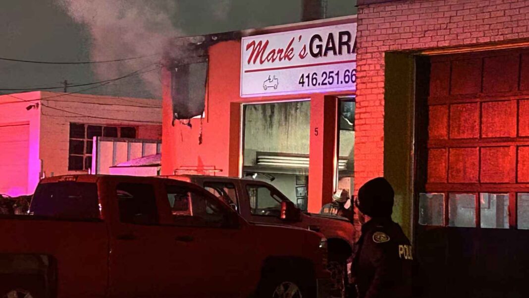 One firefighter was injured in a blaze at a auto shop in Etobicoke early Wednesday morning.