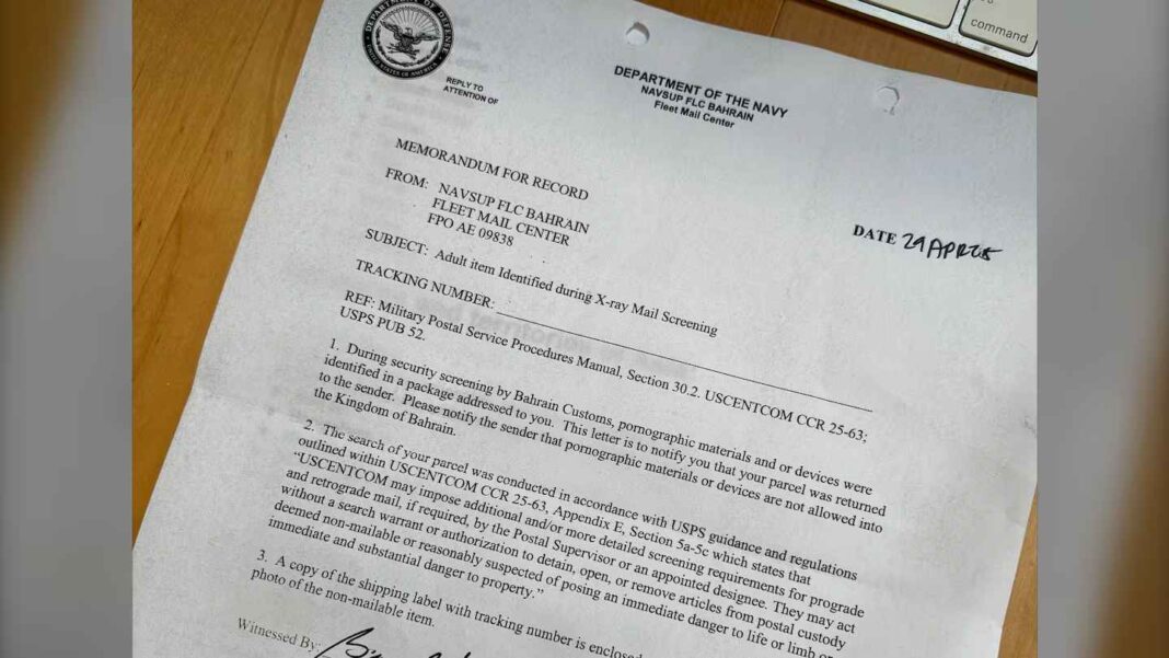 “During security screening by Bahrain Customs, pornographic materials and or devices were identified in a package addressed to you. This letter is to notify you that your parcel was returned to the sender,” the letter, with the subject line ‘Adult item Identified during X-ray Mail Screening,’ reads in part.